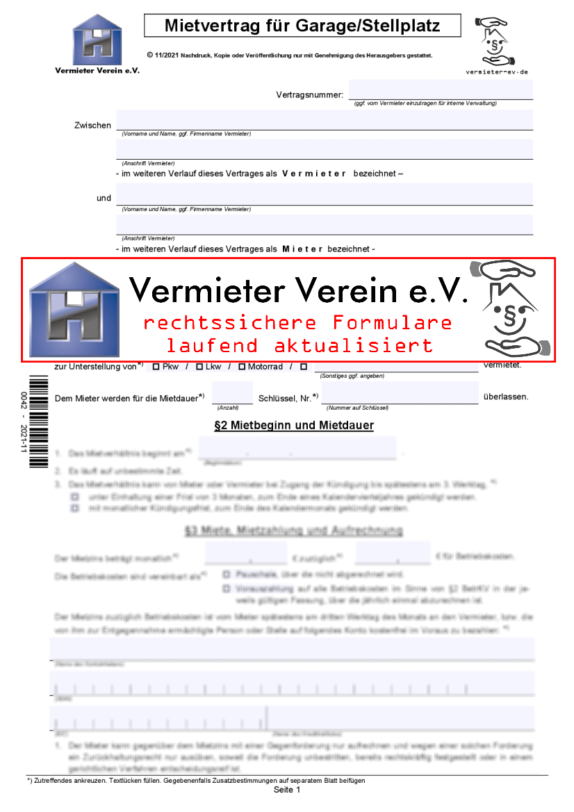 Mit diesem Formular vermieten Sie Garagen oder Stellplätze rechtssicher.
