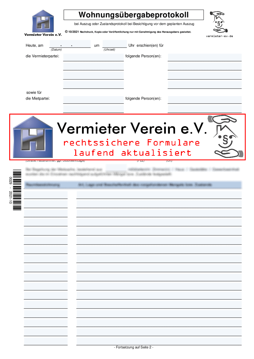 Mehrseitiges, selbstdurchschreibendes Übergabeprotokoll für den Auszug eines Mieters aus einer Wohnung, einem Haus oder einer Gewerbeimmobilie.